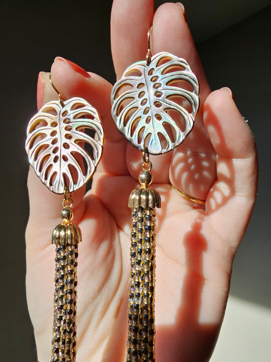 Abalone Monstera Shoulder Duster Beaded Tassel Earrings